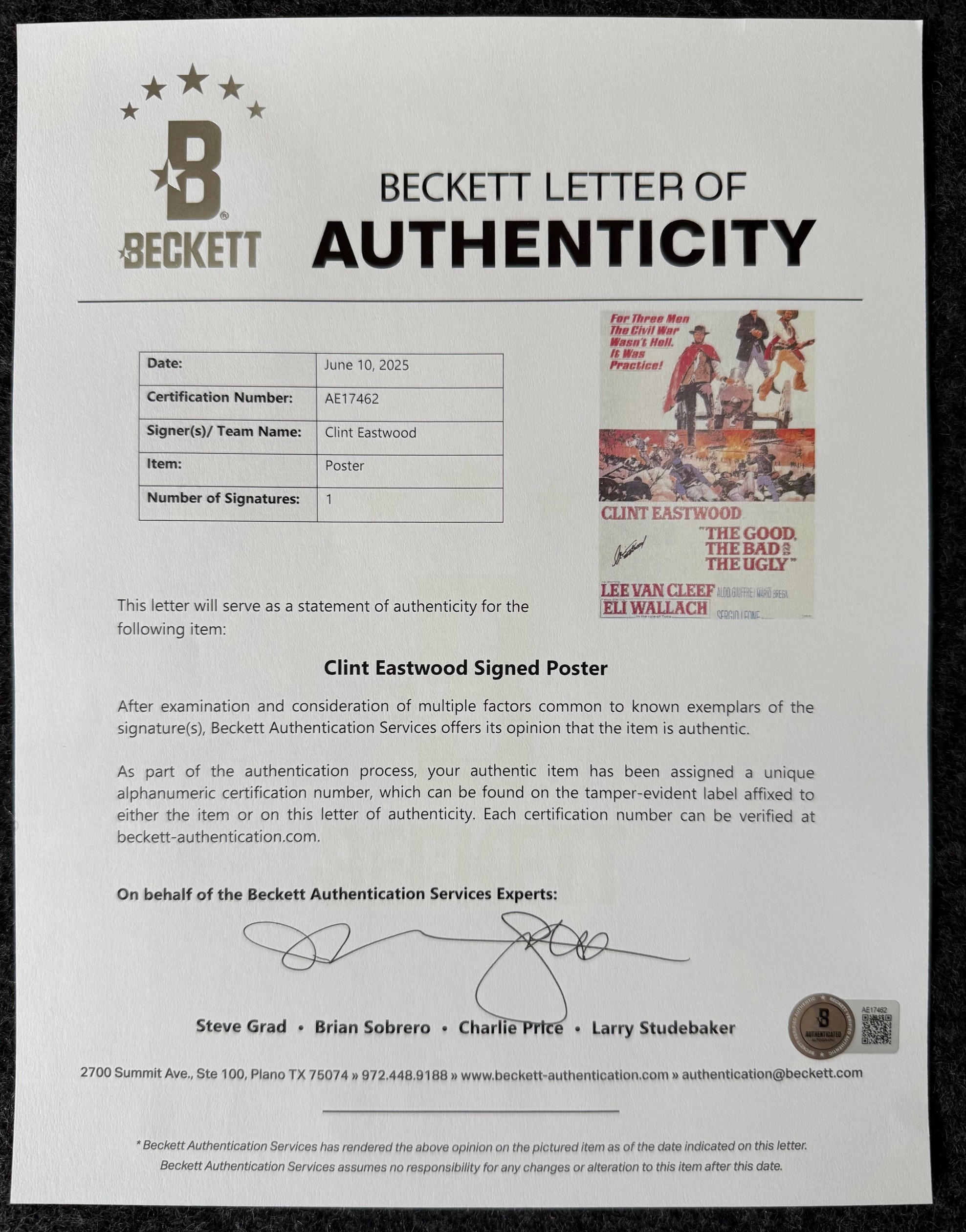 Full size one-sheet single-sided reprint “The Good, The Bad, and The Ugly” movie poster, beautifully signed in black marker by Clint Eastwood.